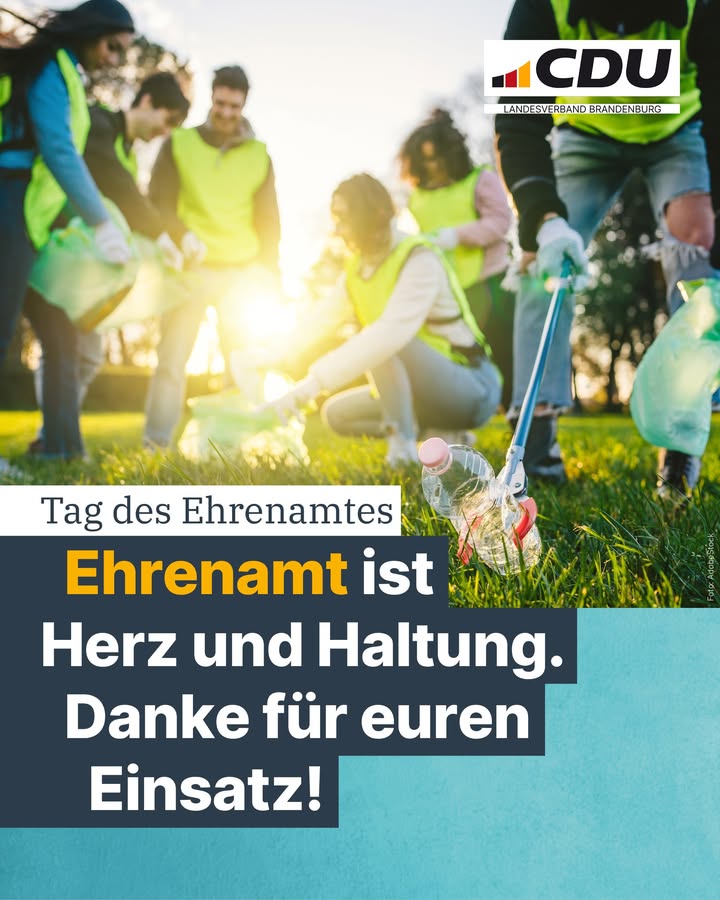 mehrWir sagen Danke an alle, die sich in Brandenburg für ihre Mitmenschen einsetzen ? im Verein, in der Feuerwehr, im Sport, in der Pflege, in der Nachbarschaft oder in unzähligen anderen Bereichen.Ehrenamt hält unser Land zusammen. Ohne dieses Engagement wäre Brandenburg nicht das starke, solidarische Zuhause, das es ist.Als CDU setzen wir uns dafür ein, dass freiwilliges Engagement weiterhin die Unterstützung bekommt, die es verdient ? verlässlich, unbürokratisch und wertschätzend.Danke an alle, die jeden Tag anpacken. Ihr macht den Unterschied. 💪
