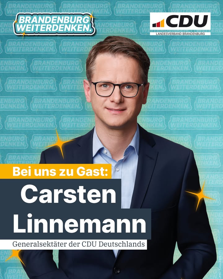 mehrZu unserem Landesparteitag dürfen wir Carsten Linnemann, den Generalsekretär der CDU Deutschlands, als Gast begrüßen. 🇩🇪Gemeinsam wollen wir Brandenburg weiterdenken ? mit klaren Ideen, neuen Impulsen und dem Ziel, unser Land stark für die Zukunft zu machen. 💪Wir freuen uns auf spannende Diskussionen, motivierende Reden und viele Begegnungen beim #LPT25! 🚀#CDUBrandenburg #CDU #CarstenLinnemann #BrandenburgWeiterdenken #ZukunftGestalten #Landesparteitag