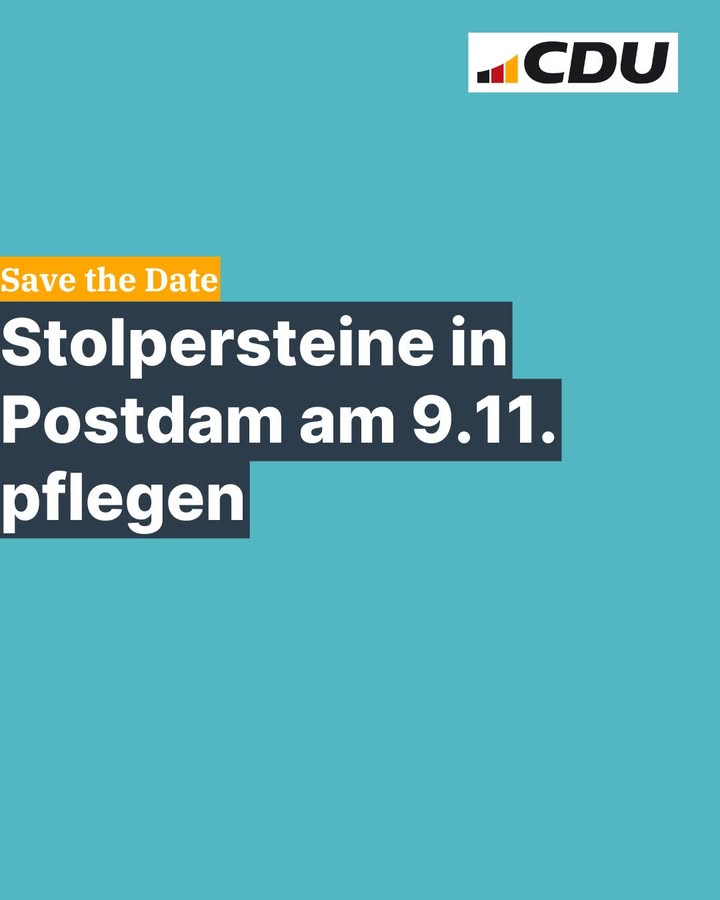 mehrDie CDU Babelsberg/Zentrum Ost unterstützt die Initiative der Ev. Kirchengemeinde Babelsberg und ruft auf, am 09.11.2025 die Stolpersteine zu pflegen.Ungefährer Ablauf15:00 Uhr - Ankommen in der Friedrichskirche, einander wahrnehmen, "Verteilen" der Stolpersteine15:15 Uhr - 16:15 Uhr - Putzen der Stolpersteine, Entzünden eines Lichtes (bereiten die Konfis für jeden Stolperstein vor) und Lesen der Kurzbiograhie. Wir haben die Kurzbiograhien aller, für die bis 2024 ein Stolperstein verlegt wurde; von den 12 neuen Stolpersteinen fehlen sie uns, da sie leider noch nicht auf der Website der Stadt Potsdam stehen und ich auch nicht unter Stolpersteine.eu fündig wurde.ab 16:15 Uhr - Rückkehr in die Friedrichskirche, Austausch des Erlebten bei Tee und evtl. Verabredungen fürs nächste Jahr