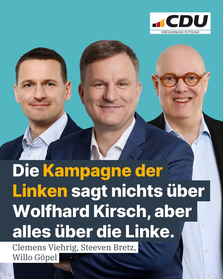 Linke sind im zwischenmenschlichen Umgang verroht. Sie nennen sich selber sozial, dabei kennt ihre Feindseligkeit gegen Andersdenkende keine Grenzen. Wer den Linken nicht passt, wird hemmungslos beschimpft und attackiert. Von der kleinen Leuchte auf der Straße bis hoch zum großen Vorsitzenden im Berliner Chefsessel ? alle Linken machen gerne mit, wenn es darum geht, Andersdenkende fertigzumachen. Das lassen wir uns nicht gefallen. Wir stehen zusammen und halten zu unseren Kollegen. Die Kampagne der Linken sagt nichts über Herrn Kirsch, aber alles über die Linke.Die Linke Potsdam Die Linke DIE LINKE. Brandenburg Isabelle Vandre